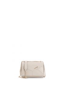 Solapa con elaboración patchwork y aplicaciones de micro remaches. bolso dividido en varios compartimentos: un tabique cerrado con cremallera y bolsillo. bandolera con cadena.