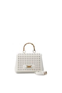 Bolso de mano con solapa perforada con láser. mango y horsebit de bambú auténtico. un solo compartimento. cierre de doble imán. bolso con bandolera.