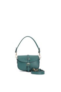solapa de piel con bandolera corta, trabilla con remache esmaltado y hebilla green