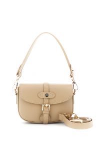 solapa de piel con bandolera corta, trabilla con remache esmaltado y hebilla taupe