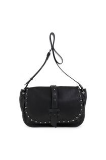 Solapa de piel sintética con efecto desgastado y descolorido, ribete de tachuelas y correa central. Las letras metálicas, el bolsillo trasero y la correa de hombro ajustable le dan un toque atrevido.