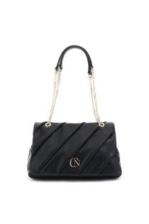 Bolso de hombro de piel sintética con solapa y pliegues, correa de cadena deslizante con tirantes acolchados. Logotipo metálico de cafetería para un toque icónico y elegante.