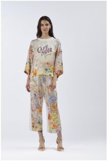 Sudadera bimateria con vestibilidad tipo caja con mangas hasta el codo. la parte delantera y las mangas son de satén de viscosa estampado y la espalda es de punto.