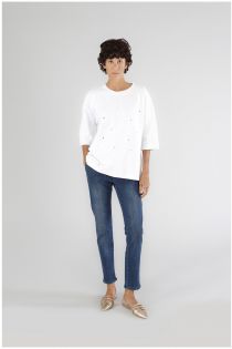 Sudadera de cuello redondo y manga 3/4 con aplicación de espejo en el delantero. ajuste cómodo. una prenda que no puede faltar en el armario de una mujer dinámica y que ama el estilo incluso en su tiempo libre.