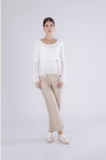 Suéter de algodón con encaje para mujer con un elegante escote madonna. el volante fruncido en el bajo y las mangas le aporta movimiento y feminidad. perfecto para looks primaverales elegantes y refinados. la modelo mide 175 cm y lleva la talla s. corte: regular.