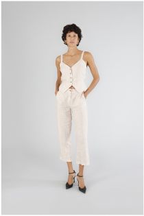 Top sin mangas con botonadura delantera y elástico trasero confeccionado en tejido de lino de raya diplomática. para un look de oficina perfecto para combinar con la chaqueta y el pantalón a juego.