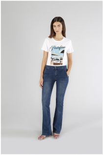 Jeans modelo anna con corte acampanado. confeccionado en lona superelástica. la prenda está diseñada para envolver la figura y realzar la forma. cinco bolsillos cierre clásico y trabillas para cinturón.