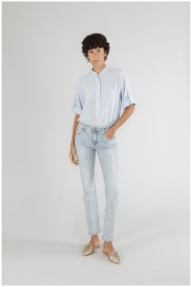 Jeans estilo audrey con corte slim. confeccionado en lona superelástica. la prenda está diseñada para envolver la figura y realzar la forma. cinco bolsillos cierre clásico y trabillas para cinturón.
