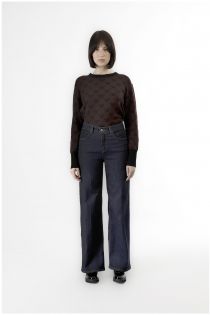 Vaqueros de mezclilla de lona súper elástica con corte ancho. trabillas en la cintura cinco bolsillos botón de tachuela con logo y cierre de cremallera. etiqueta en la espalda con logo.