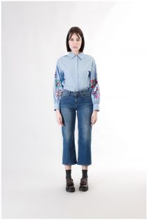 Vaqueros de mezclilla de lona súper elástica con corte culotte. trabillas en la cintura cinco bolsillos botón de tachuela con logo y cierre de cremallera. etiqueta en la espalda con logo.