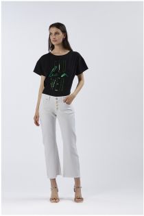 Vaqueros con vestibilidad bootcut crooped en tejido bull denim stretch. botones a la vista y dobladillo sin rematar deshilachado.