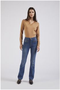 Vaqueros de tela denim superstretch de vestibilidad flare. los bolsillos de parche especiales de la parte delantera están rematados con placas personalizadas.