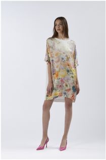 Vestido bimaterial de manga corta. la parte delantera del vestido es de satén de viscosa con estampado floral y la trasera es de punto.