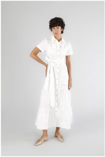 Vestido camisero largo con volante. cierre frontal con botones y fajín en cintura. mangas cortas con puños. imprescindible para el verano gracias a su sencillez y versatilidad. el vestido ligero te acompañará desde la mañana hasta la noche.