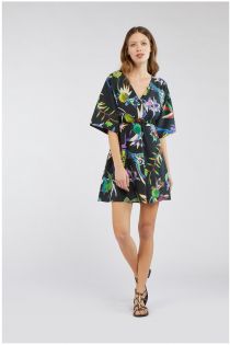 Vestido fresco y cómodo, apto para diferentes formas físicas, con un delicado fruncido bajo el pecho, cruce en el escote y mangas kimono tres cuartos.