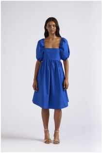 Un vestido de escote cuadrado cuya particularidad es un lazo evidente en la espalda. mangas tipo globo cortas. vestido de popelina de algodón.