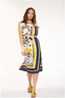 Elegante vestido con modelo falso cruzado en satén de viscosa estampado con detalle de rayas y flores. Contrastes de color liso para bordes en el escote