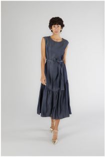 Vestido sin mangas con volante y fajín en tejido tencel jeans. una prenda imprescindible para tener en tu armario. para combinar con un zapato deportivo y una chaqueta de cuero para un look más deportivo o para un look único y elegante combínalo con una sandalia.