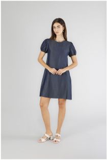 Vestido túnica de manga corta en tejido tencel jeans. abotonado en la espalda. una prenda imprescindible para tener en tu armario. para combinar con un zapato deportivo y una chaqueta de cuero para un look más deportivo o para un look único y elegante combínalo con una sandalia.