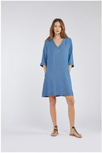 Vestido evasé de tencel efecto vaquero. La prenda presenta contrastes de tejido estampado en los bordes de las mangas y el escote.