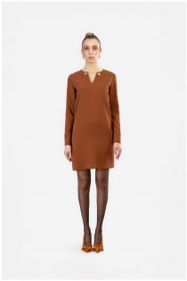 vestido recto con escote en "v" en tejido bielástico tobacco