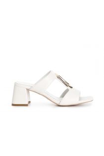 Zapatilla con doble banda y complemento metálico decorado. la plantilla acolchada de piel auténtica hace que el zapato sea cómodo incluso después de varias horas de uso. el tacón es de 6 cm.