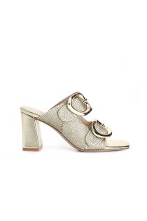 Zapatilla con bordado de cordón y doble hebilla. la plantilla es de piel. tacón ancho de 8.5 cm de altura. zapato elegante estiloso y formal.