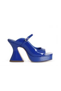 Zapatilla efecto charol con cinturón y hebilla en empeine y plataforma. tacón de carrete alto de 90 mm de altura. un zapato cómodo caracterizado por su puntera cuadrada. parte superior sencilla y envolvente.
