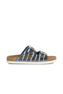 Sandalias tipo zapatilla plana con doble hebilla con motivo de strass y lentejuelas. forro de piel. cuña de 2.4 cm de altura. un cruce entre boho y étnico para un verano lleno de estilo