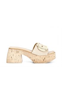 Zapatilla de ante y rafia con hebilla. el tacón tiene 7 cm de altura.