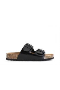 Zapatilla de charol para mujer. doble banda con hebillas. cómodo lecho del pie.