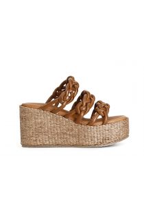 Zapatilla con tres bandas con detalle trenzado. cuña forrada de rafia.