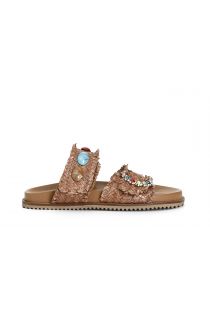 Zapatilla de piel tejida con doble hebilla. accesorio joya. cierre de velcro. el forro y la plantilla son de piel. cómoda fussbett de 2.5 cm de altura.