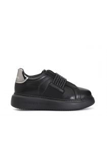 Zapatillas deportivas de piel con inserciones de glitter y laminadas. las microtiras elásticas con pedrería enriquecen y embellecen el zapato y facilitan el ajuste. la suela es tipo caja y la plantilla es de piel.