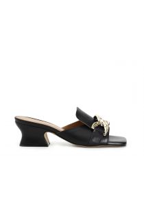 Zapatilla de piel con accesorio de cadena dorada y tacón de carrete.