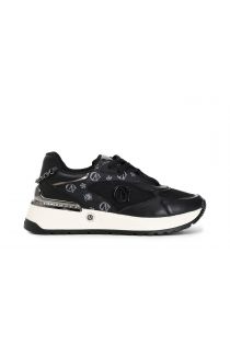 Zapatillas deportivas con suela running personalizada con logotipo lateral, pala de mesh y piel con inserciones laminadas. Una pequeña cadena detrás sirve de adorno y el logotipo metálico decora el lateral.