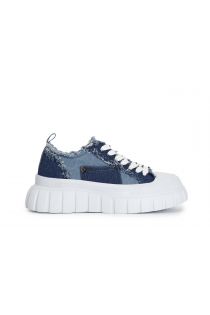Zapatillas deportivas con cordones en tejido vaquero deshilachado. la puntera de goma decora el zapato. suela elevada de 55 mm decorada con un motivo de rayas.