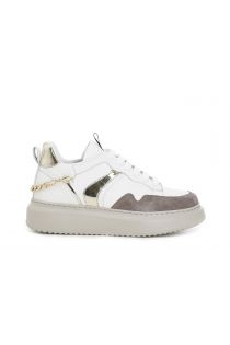 Zapatillas deportivas de piel con cadena decorativa en el talón y pala adornada con inserciones en piel de ante y laminada. Suela tipo caja total white.