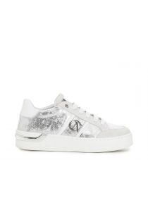 Zapatillas deportivas de piel metalizada con pequeñas inserciones laminadas. Suela tipo caja con inserción metalizada.