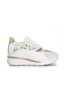 Zapatillas deportivas de piel con estampado de pedrería termosellado en la parte delantera y motivo lateral. suela con cuña bicolor de 40 mm con logotipo en relieve.