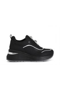 Slip-ons para mujer de piel revestida con inserciones efecto laminado y accesorio joya decorado. plantilla interna.