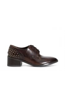 Zapato derby con cordones para mujer. la parte superior es de piel y está adornada con tachuelas en la puntera. altura del tacón 50 mm. la plantilla es de piel