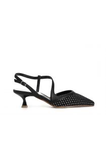 zapato de salón abierto por detrás modelo asimétrico de red con pedrería en la parte delantera black