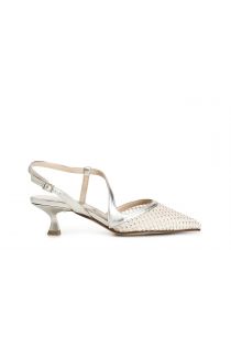 Zapato de salón efecto laminado abierto por detrás caracterizado por una malla decorada con pedrería. cinturón por detrás y escote asimétrico. forma esbelta. tacón de carrete de 45 mm de altura. calzado de moda para el día a día que satisface las exigencias de un estilo de vida dinámico.