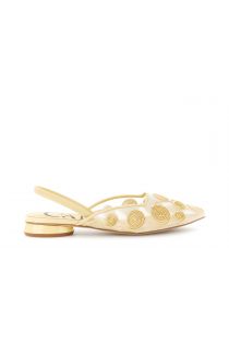 Zapato destalonado de malla con bordado cornely y ribete de efecto cuero. plantilla de cuero y tacón de 1.3 cm. este zapato ligero y femenino aporta un toque creativo a los looks veraniegos más chic.