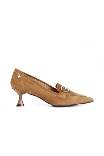 Zapatos de salón de ante para mujer con un estilo elegante y femenino. zapato acompañado con un accesorio especial en el empeine. tacón de carrete de altura 65 mm. plantilla de piel suave.