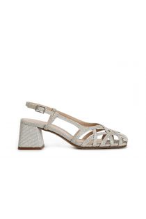 Zapatos abiertos en tejido de lúrex con jaula asimétrica trenzada. calzado con forma redondeada. lazo en la parte posterior. tacón de 45 mm de altura. muy cómodo perfecto para el día a día.