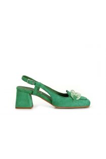 zapatos de ante abiertos por detrás con un horsebit transparente green