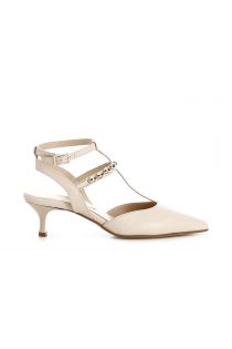 zapatos de salón con jaula que rodea el tobillo y cadena decorativa beige