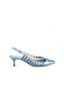 Dècollète de piel laminada con juego de bandas laterales en un tono de color más oscuro pero a juego. Hebilla en la parte trasera y tacón medio.
